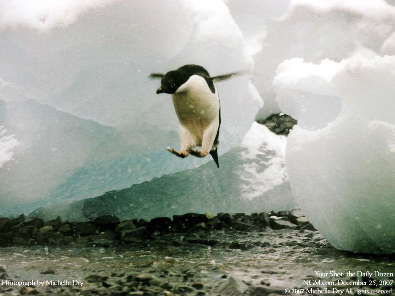 تصوير جالب از پريدن يک پنگوئن از روي يخ هاي درحال ذوب شدن ، اين تصوير جالب از مجموعه عکسهاي برتر ماه دسامبر 2007 درسايت نشنال جئوگرافيک (nationalgeographic) مي باشد پَنگوئنها پرندگاني هستند بدون قدرت پرواز از راسته گُوِهسانان (Sphenisciformes) از خانواده گُوهگان (Spheniscidae) که از ماهيها تغذيه ميکنند آنها بالهاي کلفتي دارند که به عنوان باله شنا از آن استفاده ميکنند. پنگوئنها در جاهاي سردسيرنيمگردي پاييني زمين زيست ميکنند.نام راسته و خانواده آنها نمايانگر شکل گوهاي بدن آنها است.از نظر ريشهاي نام پنگوئن متعلق به پنگوئن اقيانوس منجمد شمالي ميباشداين پرندگان قادر به پرواز نيستند زماني که ملوانها به اقيانوس منجمد جنوبي رسيدند همين نام را به پرندگان آنجا که قادر به پرواز نبودند اطلاق کردند. در مورد ريشه اين نام گوناگون گويند.