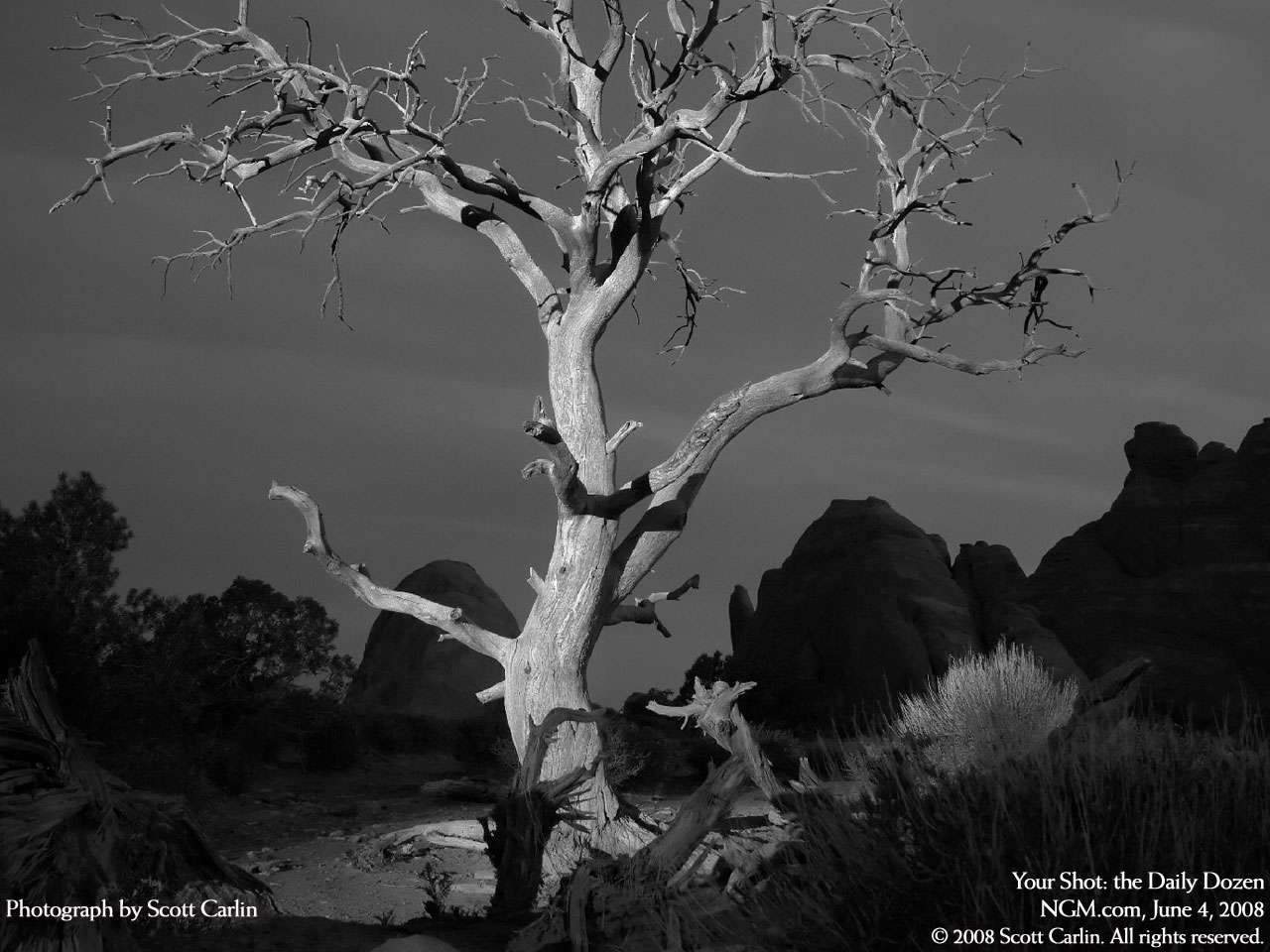 تصوير سياه و سفيد اما هنري از يک درخت خشکيده در صحراي يوتا، اين تصوير در شب گرفته شده است و نورپردازي حرفه اي آن باهث زيبايي دوچندان شده است اين عکس از مجموعه عکسهاي برتر ماه ژوئن 2008 درسايت نشنال جئوگرافيک (nationalgeographic) مي باشد . «يوتا» يکي از ايالات صحرايي آمريکاست، همان جايي که بارها بمبهاي اتمي و هيدروژني در آنجا امتحان شده است. دانمشندان «ناسا» منطقهاي در اين صحرا را به شکل «مريخ» در آوردهاند و شش دانشمند شب و روز در آنجا به تحقيق ميپردازند