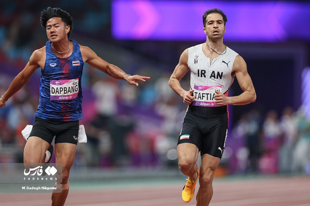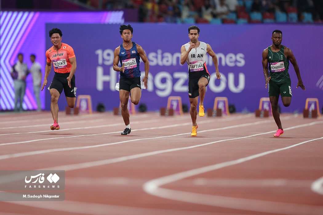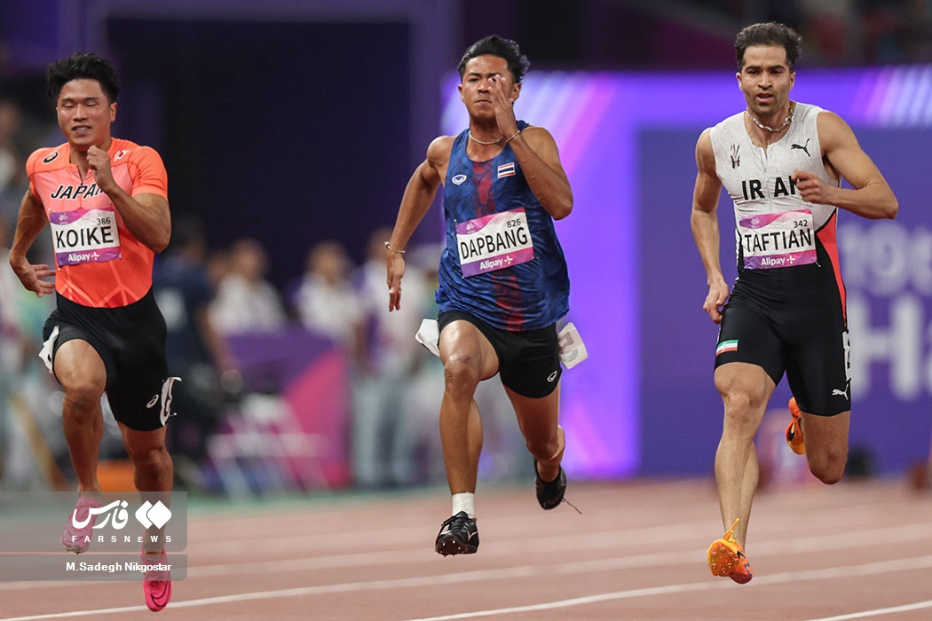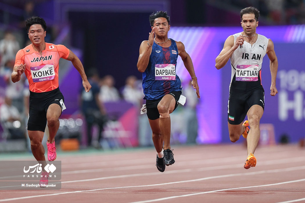 حسن تفتیان که روز گدشته به مرحله نیمه نهایی مسابقات دوی ۱۰۰ متر نوزدهمین دوره بازی های راه یافته بود، امروز شنبه ۸ مهر ۱۴۰۲ در این مرحله به رقابت پرداخت.دونده سرعتی کشورمان در این مرحله با رکورد ۱۰.۱۳ ثانیه از خط پایان عبور کرد و به عنوان نفر اول دسته خود به فینال صعود کرد.در فینال دوی ۱۰۰ متر مردان حسن تفتیان نماینده کشورمان که به عنوان نفر اول گروه خود و با رکورد ۱۰.۱۳ ثانیه به فینال رسیده بود، در این مرحله با رکورد ۱۰.۱۴ثانیه در جایگاه چهارم ایستاد. منبع: فارس