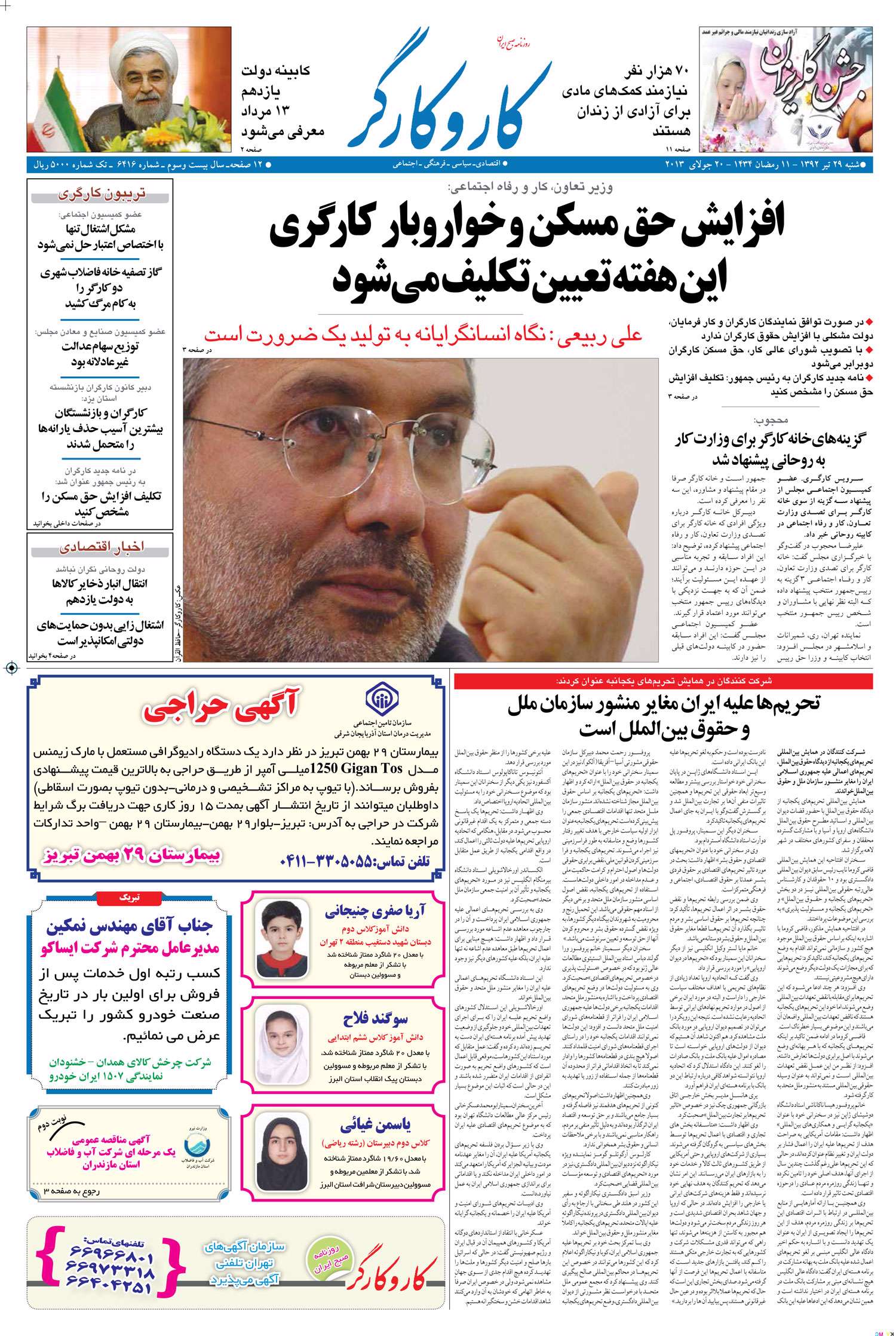 افزايش حق مسكن و خواروبار كارگري اين هفته تعيين تكليف ميشود/ گزينههايخانه كارگر براي وزارت كار به روحاني پيشنهاد شد/ علی ربیعی : نگاه انسانگرایانه به تولید يك ضرورت است/ تحریمها علیه ایران مغایر منشور سازمان ملل و حقوق بینالملل است/ 70 هزار نفر نيازمند كمكهاي مادي براي آزادي از زندان هستند/