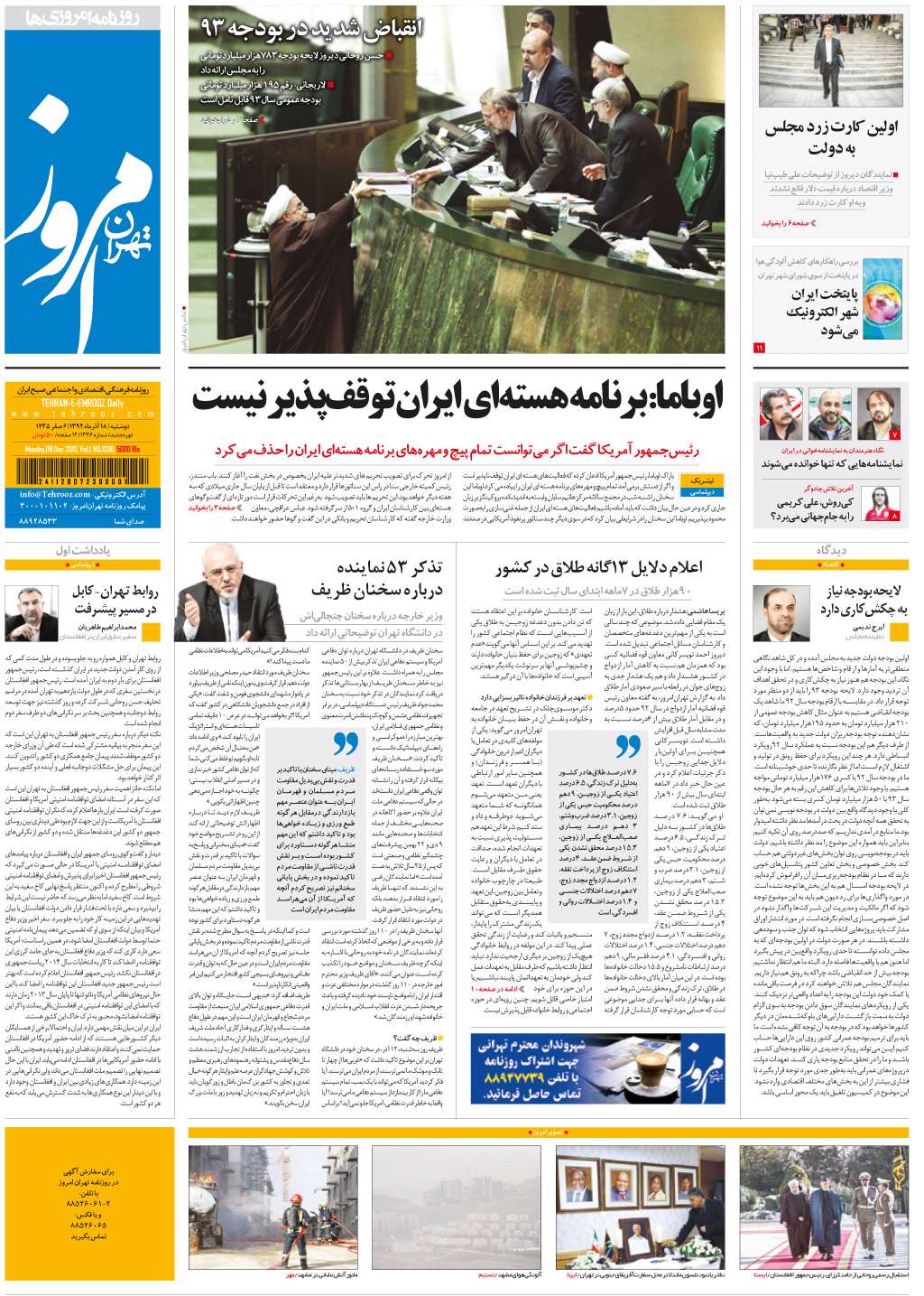 روزنامه تهران امروز، دوشنبه 18 آذر 1392