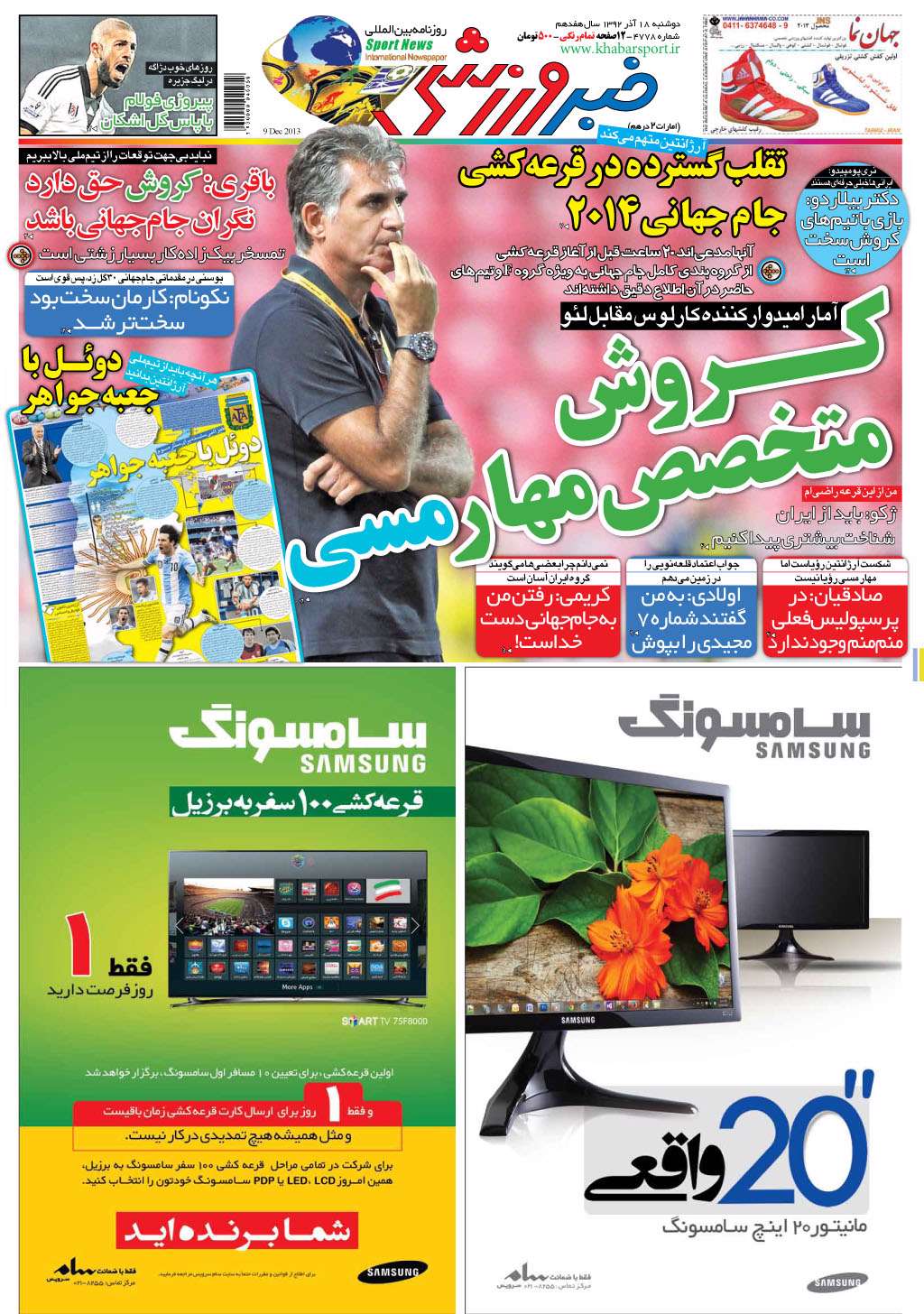 روزنامه خبر ورزشی، دوشنبه 18 آذر 1392
