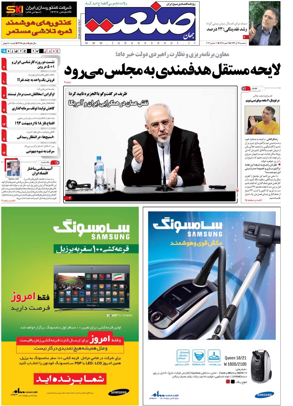 روزنامه جهان صنعت، سه شنبه 19 آذر 1392