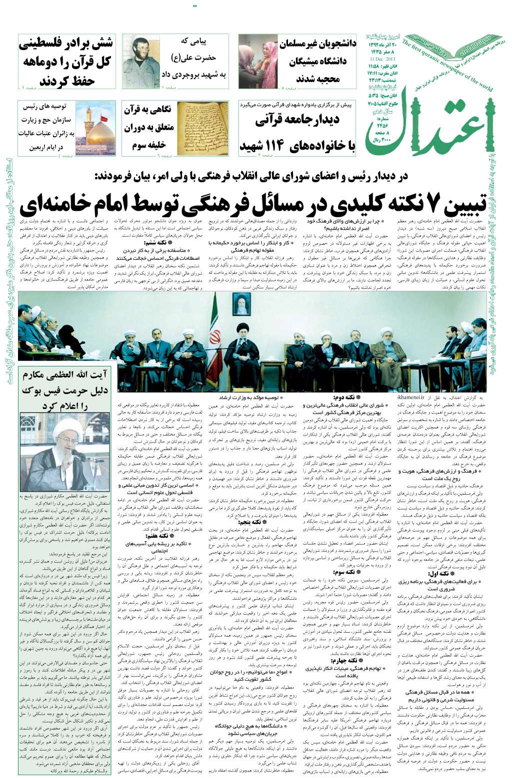 تبیین 7 نکته کلیدی در مسائل فرهنگی توسط امام خامنهای /دانشجویان غیرمسلمان دانشگاه میشیگان محجبه شدند /پیامی که حضرت علی(ع) به شهید بروجردی داد /شش برادر فلسطینی کل قرآن را دوماهه حفظ کردند /دیدارجامعه قرآنی با خانوادههای ۱۱۴ شهید /نگاهی به قرآن متعلق به دوران خلیفه سوم /توصیه های رئیس سازمان حج و زیارت به زائران عتبات عالیات در ایام اربعین